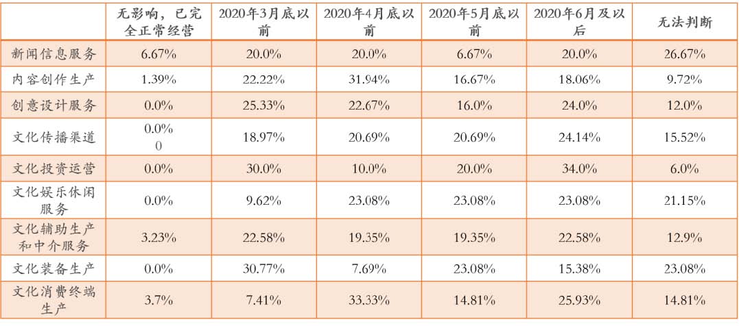 ? ? ??從不同細分業態的文化企業來看,內容創作生產、創意設計服務、新聞信息服務和文化輔助生產和中介服務領域的文化企業較為樂觀,認為4月底前可以恢復正常營業狀態的占比均接近百分之五十;而文化娛樂休閑服務領域相對悲觀,認為4月底前能完全恢復正常營業狀態的最低為32.7%。